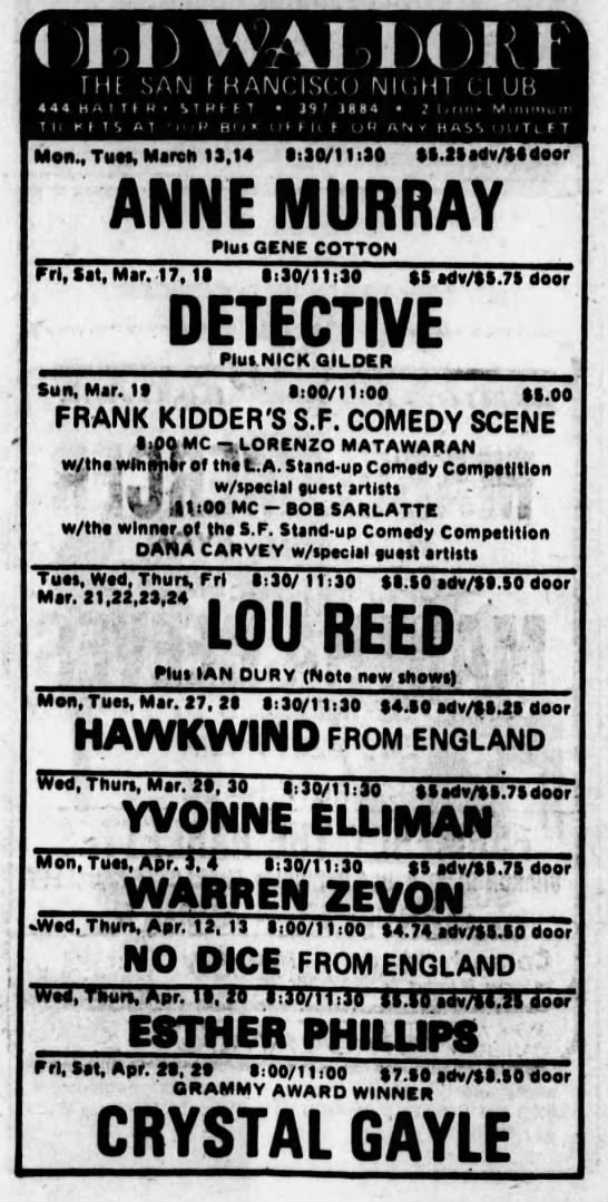 21-24 March 1978 - (2 sets each day) Old Waldorf Theatre, San Francisco, CA [newspaper ad; ticket stub]